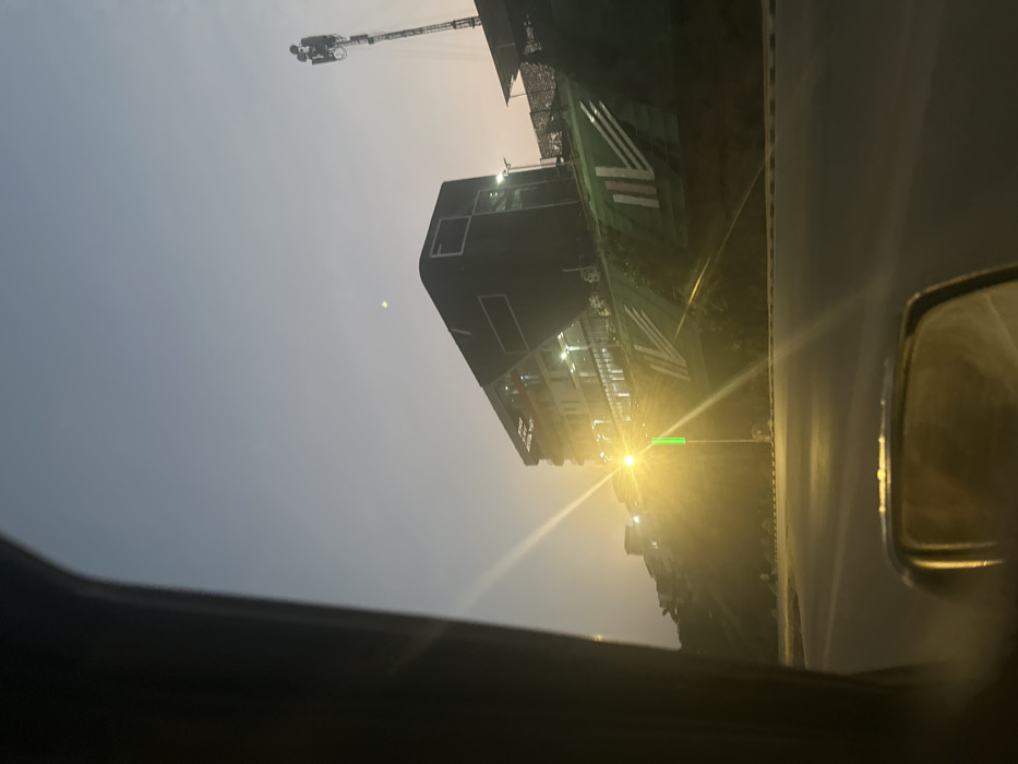 A low-angle shot from inside a vehicle depicts a contemporary building with multiple levels and white diagonal accents. A construction crane is visible atop the structure. A bright street lamp illuminates the foreground. A car's side mirror is partially visible on the right. The sky is overcast with a dusky or dawn-like glow. The road is smooth and adjacent to the building.