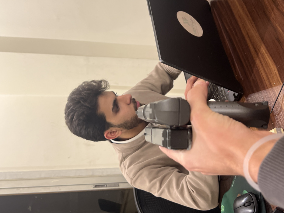 A man sits at a desk facing a laptop, his hands on the keyboard. Another person points two power drills at his face, held closely to the lens, obscuring the view of the screen. A mousepad and mouse are visible on the desk to the right, next to the drill-wielding hand. The overall image suggests a playful or staged confrontation.