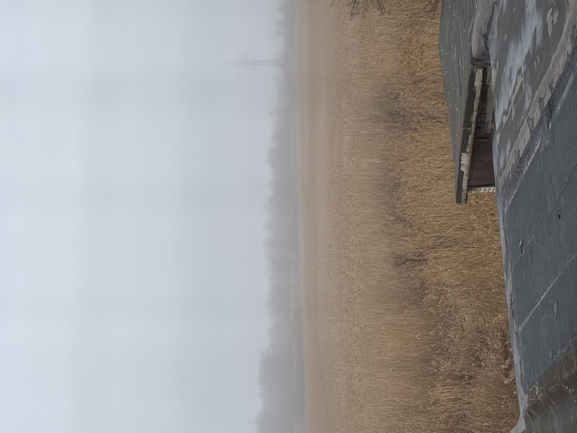 foggy landscape. A field of dry, brown grass occupies the central portion of the image. In the distance, there is a row of trees partially obscured by the fog, and a power line tower is barely visible in the haze. A concrete structure with a small, dark doorway occupies the right side of the image. The photograph appears to be taken on an overcast day. The specific location is unknown and not possible to be determined from the image, as well as the exact city.