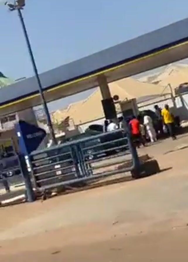 The video, taken from what appears to be a moving vehicle, depicts a street scene on a bright, sunny day. The initial shot shows a gas station with a blue and yellow awning. A man is sitting on a motorcycle near the gas station. The camera then moves past the gas station, capturing other motorcycles in motion, an ATM building with green and white colors, parked cars, and buildings of varying sizes and architectural styles, some with water towers. The road appears unpaved in sections, with visible dirt and debris. People are seen walking and riding motorcycles. The overall impression is of a bustling, somewhat dusty urban or semi-urban environment.