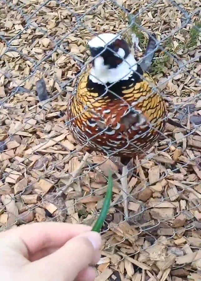 A hand is holding a thin green blade of grass in front of a wire fence. Behind the fence is a Reeves's pheasant standing on wood chips. The pheasant has a white head with a black pattern around its eyes, a brown and white patterned body, and a black tail. The pheasant pecks at the grass blade.