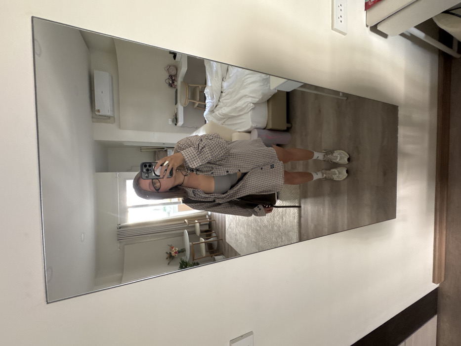 A woman in glasses, a gray top, and a plaid shirt dress stands in front of a full-length mirror, holding a smartphone and taking a photo