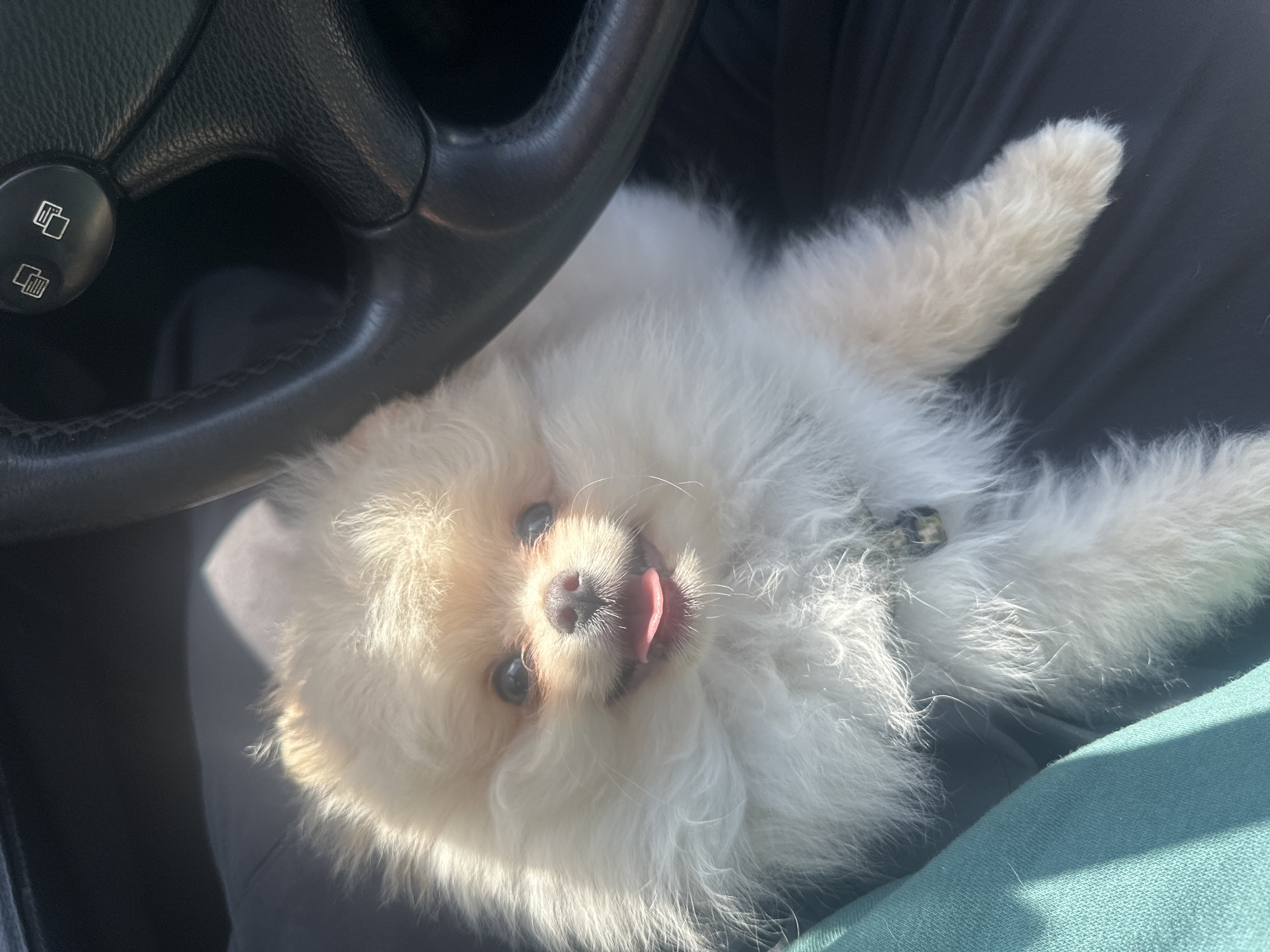 A small, cream-and-white Pomeranian dog is positioned inside a vehicle in Varna, Bulgaria. The dog faces the viewer, seated with its mouth open, pink tongue slightly extended, and its dark eyes visible. A small, metallic bell is attached to its collar. Direct sunlight from the upper left illuminates the dog. To the left, a segment of teal-colored fabric is visible, indicating a person's garment. A black leather steering wheel, featuring a dark circular button with two white rectangular display icons, occupies the upper right portion of the frame. The immediate vehicle interior environment appears dark.