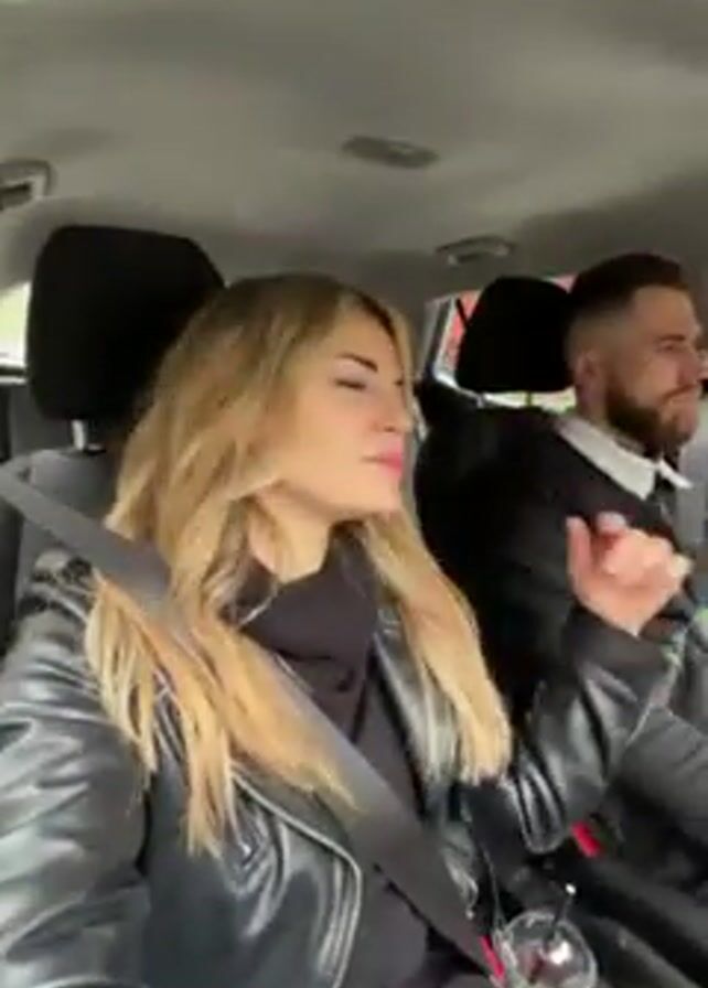 Inside a car, a blonde woman in a black leather jacket sits in the passenger seat, wearing a seatbelt. She looks at the camera and sings along to music playing, occasionally glancing around. A man with a beard, wearing a dark jacket over a white collar, drives the car. The interior of the car is visible. There are drinks in the center console.