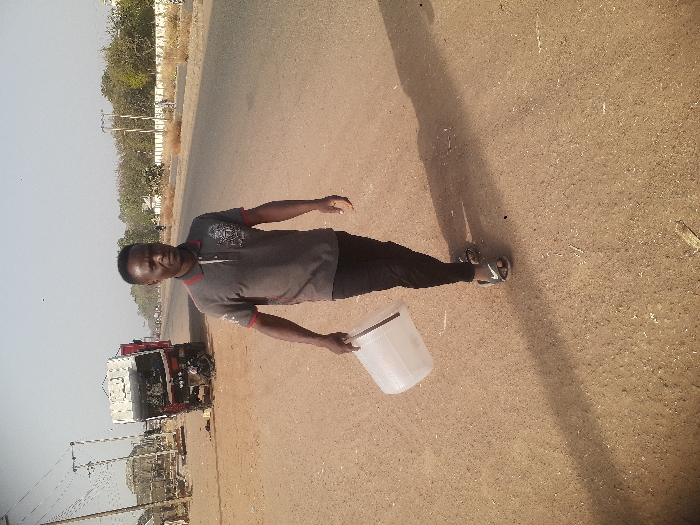 A man in a grey polo shirt and black pants stands on a paved road. He's holding a translucent white bucket. Behind him are parked vehicles and roadside vegetation. The day appears sunny, casting a long shadow of the man onto the road. He is also wearing white flip-flops. The scene is set against a clear, light-blue sky.