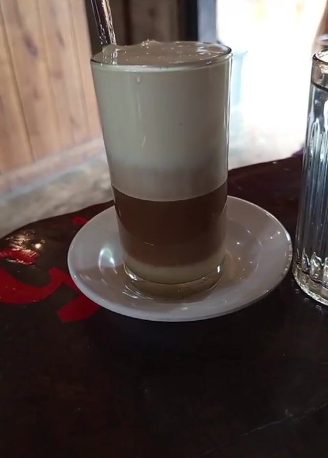 glass of layered drink sitting on a white saucer on a wooden table. The drink has three distinct layers: a creamy white layer on top, a brown layer in the middle, and a clear liquid layer at the bottom. A metal spoon is stuck in the top layer of the drink. To the right of the glass is a clear, empty glass with a ridged design. The table appears to be dark wood with some red accents visible. In the background, there is a wooden structure resembling a bar or counter. The lighting is ambient, suggesting an indoor setting. The camera is static and focused on the drink.