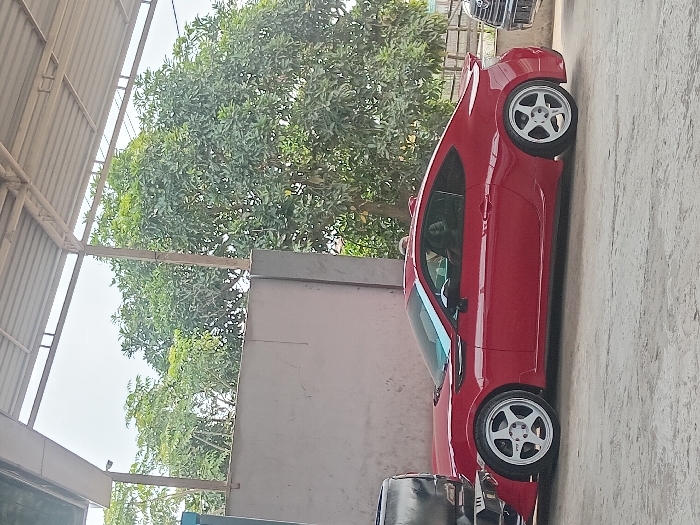 A red coupe sits stationary on a concrete surface beside a light gray wall. The vehicle has aftermarket white wheels and a lowered stance. Trees are visible in the background, partly obscured by the wall. Overhead, a metal roof structure with corrugated panels extends from the left side of the frame. Another vehicle, possibly a car, is partially visible in the upper right corner.
