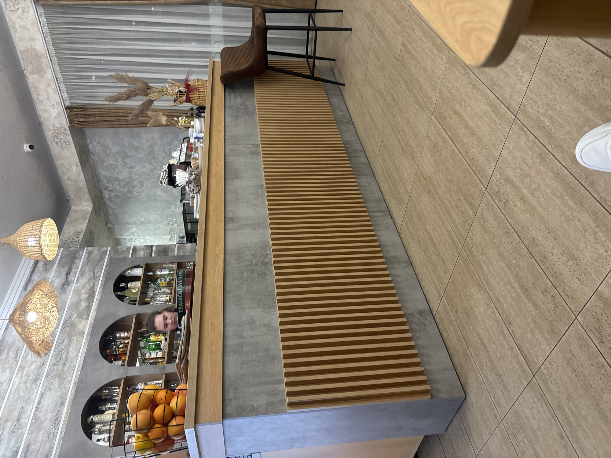 interior of a business in Burgas, Bulgaria. The scene is viewed from a high angle, focusing on a countertop and seating area. The counter has a distinctive front design with horizontal wooden slats of alternating light and dark tones. Above the counter, shelves display various items, including a wire basket filled with oranges and lemons, along with bottles of alcohol and other goods, suggesting a bar or cafe setting. A person is partially visible behind the bar. The flooring is tiled with large, tan-colored tiles with a speckled texture. A brown leather chair with a black metal frame is visible at the end of the countertop. A glimpse of a light-colored shoe is seen on the floor. Two wicker pendant lamps hang from the ceiling. Curtains are visible in the background.