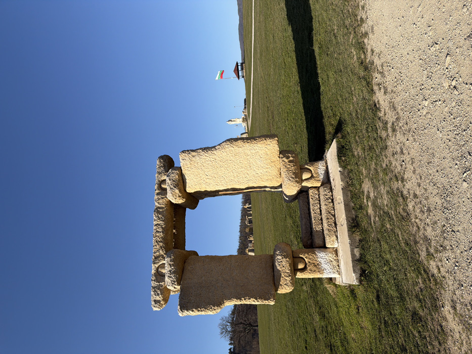 The scene depicts an expansive, verdant grassy field in Rayuvtsi, Bulgaria, under a clear, cloudless blue sky. In the foreground, a prominent, rough-hewn stone archway stands centrally. This structure, appearing beige to yellowish-brown, is composed of two substantial vertical pillars with rounded bases and tops, supporting a thick, flat horizontal lintel. Smaller, rounded stone elements connect the main components. A light-colored concrete foundation with three rough-cut stone steps is visible at the base of the archway. To the mid-left, a gentle, treeless hill displays a curved arrangement of approximately ten smaller, monolithic stone structures resembling menhirs. In the mid-distance to the right, a tall, white statue or monument is situated on a slight elevation. Adjacent to this monument, a hexagonal wooden gazebo with a dark red roof is visible. Immediately next to the gazebo, a flagpole displays the national flag of Bulgaria, characterized by horizontal stripes of green, white, and red. A light brown gravel path curves into the frame from the lower right corner, extending towards the foreground. Strong, direct sunlight casts distinct, elongated shadows from the archway and other distant objects towards the lower right portion of the image. No human or animal subjects are present within the frame.