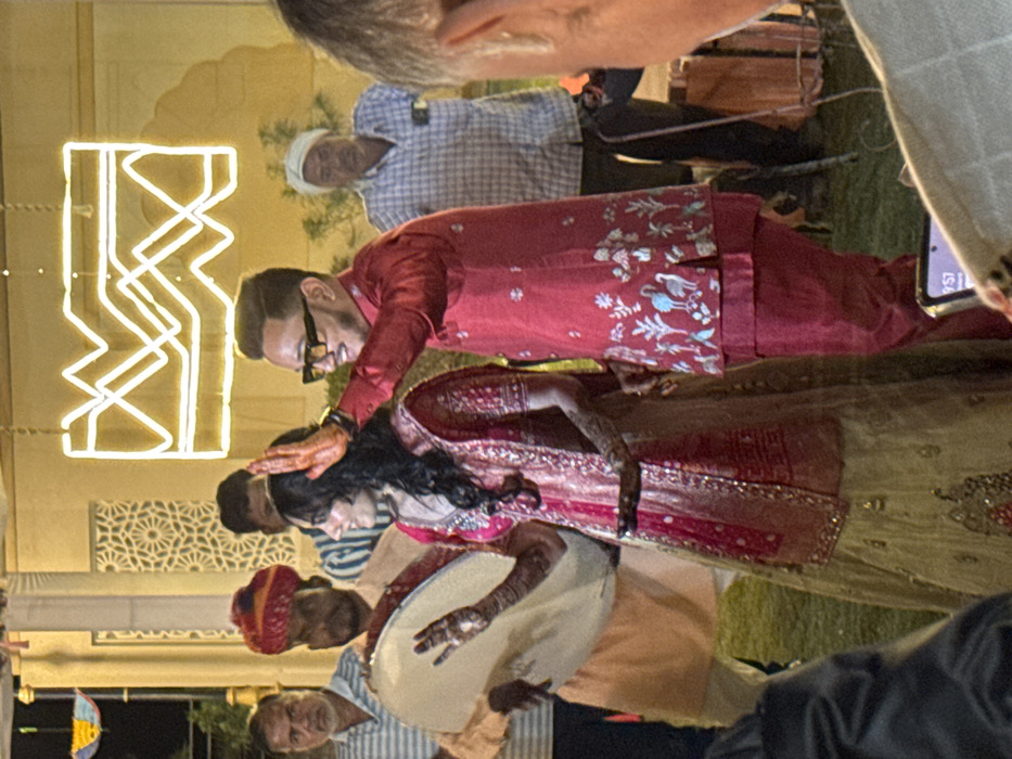A wedding scene shows a bride in red and gold attire receiving a blessing from a groom in a red floral sherwani. A man with a red turban is next to the bride. Another man plays a drum behind them. An ornamental lighting fixture is adjacent to them on the left. There are other people in the background.