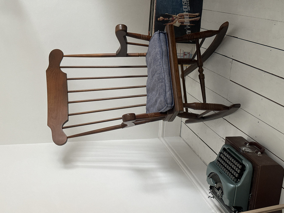 An indoor residential scene is depicted within the city of Folkestone and Hythe District, United Kingdom; the specific location within the city is not visually determinable. A dark brown wooden rocking chair, featuring a spindle back and armrests, stands on white-painted wooden floorboards. A rectangular, light blue-grey fabric cushion is placed on the chair's seat. To the left of the chair, a teal-colored portable typewriter with black keys rests on its dark brown carrying case. In the background, to the right, a stack of vinyl records leans against the white wall, with the top record album identified as "Amy Winehouse Back to Black." The walls are uniformly white, with a white skirting board running along the base. Shadows from external light sources are visible on the left wall.