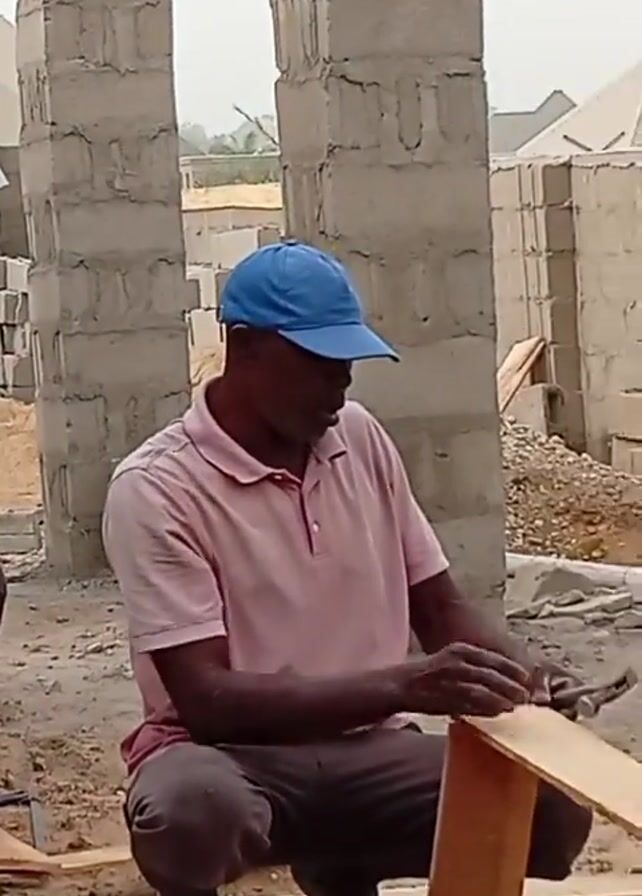 A man wearing a pink polo shirt and a blue baseball cap is squatting on the ground at a construction site, hammering a nail into two pieces of wood. He is working barefoot, surrounded by wooden planks and construction materials. Behind him are unfinished concrete walls and other buildings. Another person stands to his left, partially out of frame.