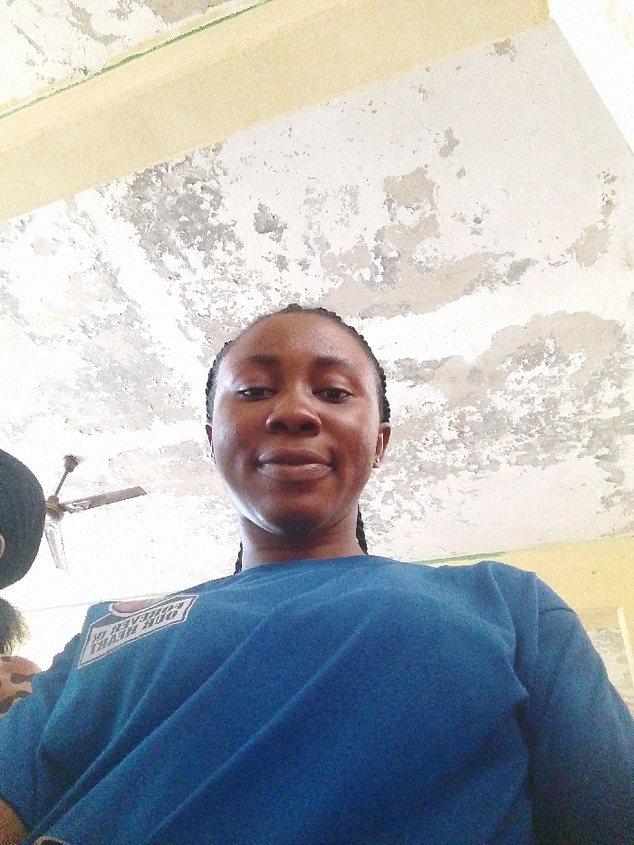 A young African woman with braided hair is depicted in an upward-angled indoor shot, looking directly at the camera with a subtle smile. She wears a blue long-sleeved top with a partially visible, reversed graphic on her chest that reads "FOREVER IN OUR HEART." The background reveals a high ceiling painted a pale yellow, exhibiting widespread peeling paint, gray discoloration, and evidence of water damage. A dark-colored, multi-bladed ceiling fan is visible in the upper-left quadrant, appearing stationary. The scene depicts an interior space within the city of Nsukka, Nigeria, characterized by an aging or structurally compromised environment.