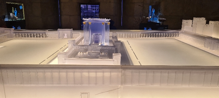 An illuminated, translucent architectural model of the Second Temple complex in Jerusalem, Israel, is prominently displayed within a dimly lit exhibit space
