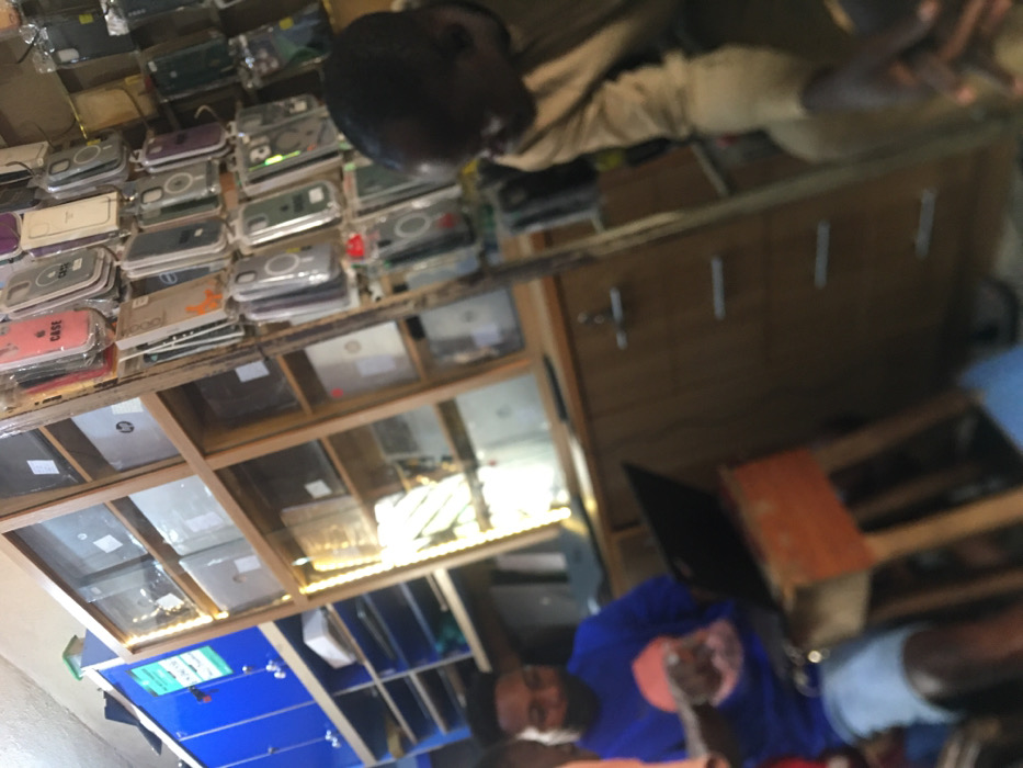 A man is seen from above, looking at products on display shelves. The shelves contain numerous items, including phone cases and laptops. The area is illuminated by strip lights. The man wears a brown shirt and blue shorts. Another man in a blue shirt is seen from the chest down, working on a laptop. A cabinet with vertical handles is partially visible. The image appears to have been rotated counterclockwise.