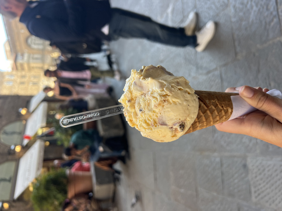 - "A close-up image focuses on a hand holding a waffle cone with two scoops of gelato in a bustling urban environment identified as Florence, Italy" by FM-s8vsM2, licensed under CC BY 4.0