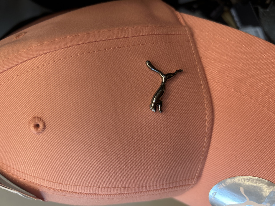 The image displays a close-up, angled view of a peach-colored baseball cap. The cap features a textured fabric, likely cotton twill, with visible diagonal ribbing and multiple stitching lines forming its panels. A metallic, gunmetal grey Puma logo, depicting a leaping feline, is prominently affixed to the front panel, positioned towards the lower right of the cap's crown. At the apex of the cap, a small, circular, fabric-covered button is visible. A circular, reflective sticker with a white Puma logo and partial text (reading "PUMA ONE SIZE FITS ALL") is adhered to the cap's brim on the lower left side of the frame. A white tag is partially visible along the upper left edge of the cap. The background is dark and out of focus, providing no discernible details about the immediate surroundings. No people or specific actions are depicted. The image contains no visual information to determine a precise location within Shumen, Bulgaria, or any other city.