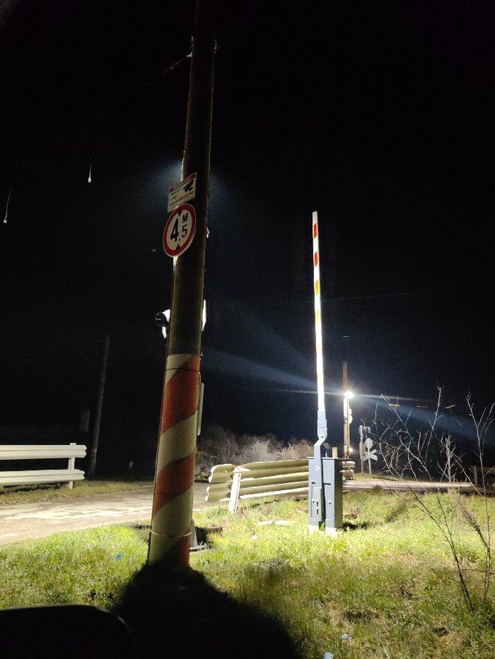 This image depicts a railway crossing at night in the city of Dralfa, Bulgaria