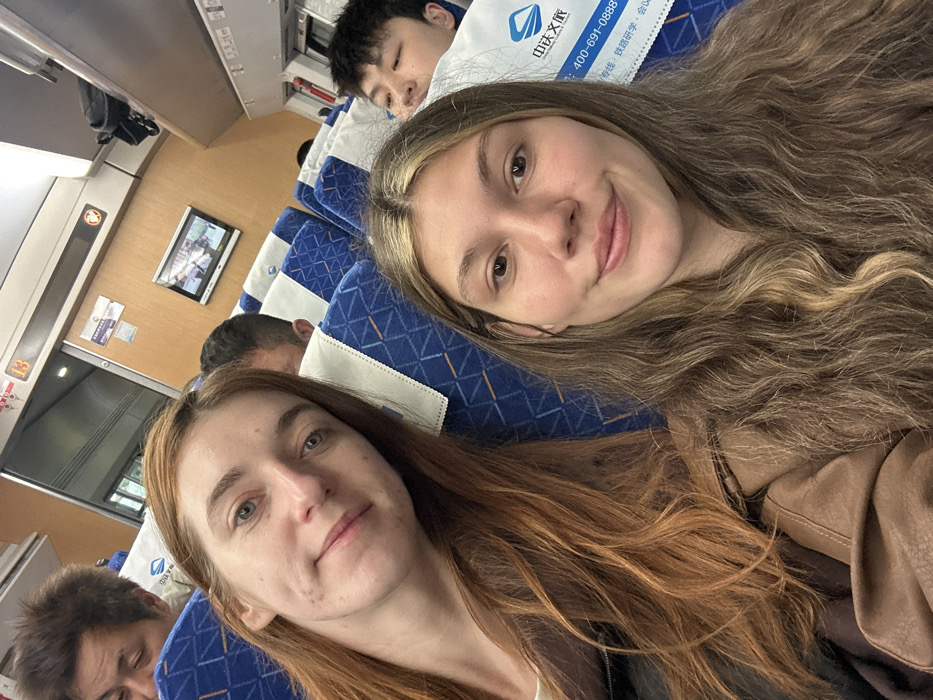 This image captures a selfie taken by two young adult females inside a train car, likely within Huangdao District, China
