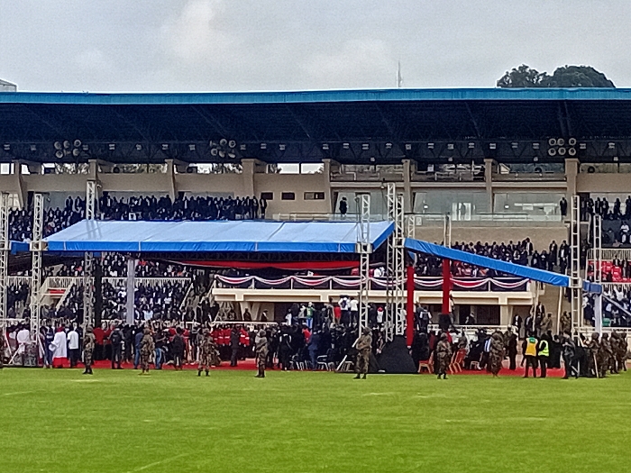 The image depicts a large-scale public gathering within a stadium, identified as Moi International Sports Centre, Kasarani, located in Nairobi, Kenya. The foreground consists of a broad expanse of green grass, characteristic of a stadium's playing field. Numerous individuals are dispersed across this field. A significant number wear camouflage military uniforms, many standing upright, some carrying what appear to be rifles, indicating security or ceremonial military presence. Other individuals on the field include civilians in diverse attire, some in formal wear like suits, others in white robes, and a few in high-visibility yellow vests, likely event staff. Several temporary chairs are arranged on the grass, some occupied. In the midground, a prominent temporary stage structure with a blue, rectangular canopy is erected. This structure is supported by a network of white metal scaffolding. Red, white, and black bunting, consistent with the colors of the Kenyan flag, adorns the front of this stage, draping below the blue canopy. Below and around this stage, additional crowds of people are gathered. The background is dominated by the stadium's multi-tiered grandstand, distinguished by its blue cantilevered roof. The grandstand is densely populated with thousands of spectators, primarily in the upper sections, observing the event below. The architectural style includes concrete structures and glass-paneled viewing boxes within the grandstand. The sky is overcast and uniformly light grey, indicating an outdoor daytime event under cloudy conditions. Green foliage from trees is visible above the grandstand roof in the distant background. The overall scene suggests a formal national event or large public ceremony.