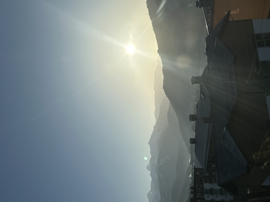 The image depicts a panoramic view of a mountainous landscape and an urban settlement, identified as Krasnaya Polyana, Russia. The scene is illuminated by a prominent sun, positioned in the upper right quadrant, emitting strong rays of light that create a hazy, backlit effect across the mid-ground. The sky is clear, transitioning from a pale blue at the top to a bright, yellowish hue near the sun. In the background, multiple layers of mountains recede into the distance, appearing progressively lighter due to atmospheric perspective. Several peaks in the leftmost portion are distinctly snow-capped, with visible snow patches and what appears to be a ski slope. A small, bright green circular lens flare is visible on one of these distant peaks. The mid-ground features a valley containing a cluster of buildings. The foreground is dominated by the dark, pitched roofs of multiple structures, likely residential or commercial. These roofs are composed of dark tiling and feature several distinct, dark-colored chimneys. Parts of building facades are visible; one on the left shows a dark lower section and a lighter upper section, while another on the right reveals a light orange-brown wall. No individuals are discernible within the frame. The overall environment suggests an alpine resort town under clear daylight conditions.