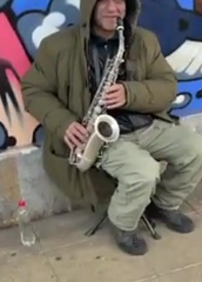 - "A man in a long olive drab coat, tan pants, and black shoes sits on a black folding stool and plays a silver saxophone" by FM-PU0HJ3, licensed under CC BY 4.0