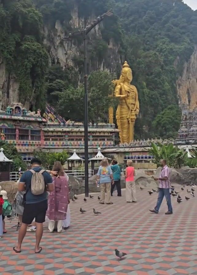 wide shot of a Hindu temple complex in front of a massive limestone hill. Several people are standing and walking on a geometrically-patterned brick plaza. Many pigeons are walking around the plaza. A towering golden statue of a Hindu deity stands prominently in the background. The sky is overcast.