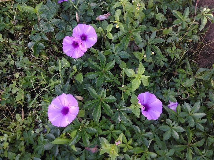 The image displays an overhead view of dense ground vegetation located in Ban Naduan, Laos. The primary subjects are four vibrant purple, trumpet-shaped flowers, consistent with the morphology of morning glories. Two of these flowers are closely adjacent, appearing as a pair in the upper-right section, while a single flower is situated in the upper-left, and another in the lower-center of the frame. These flowers are set amidst a lush mixture of various green foliage, including dark green palmate leaves, smaller ovate leaves of a lighter green hue, and some finer grass-like blades. Traces of dark soil are visible beneath the vegetation, which exhibits a natural, uncultivated appearance. No people, animals, man-made objects, or specific actions are depicted. The scene is static, showcasing an outdoor natural environment.