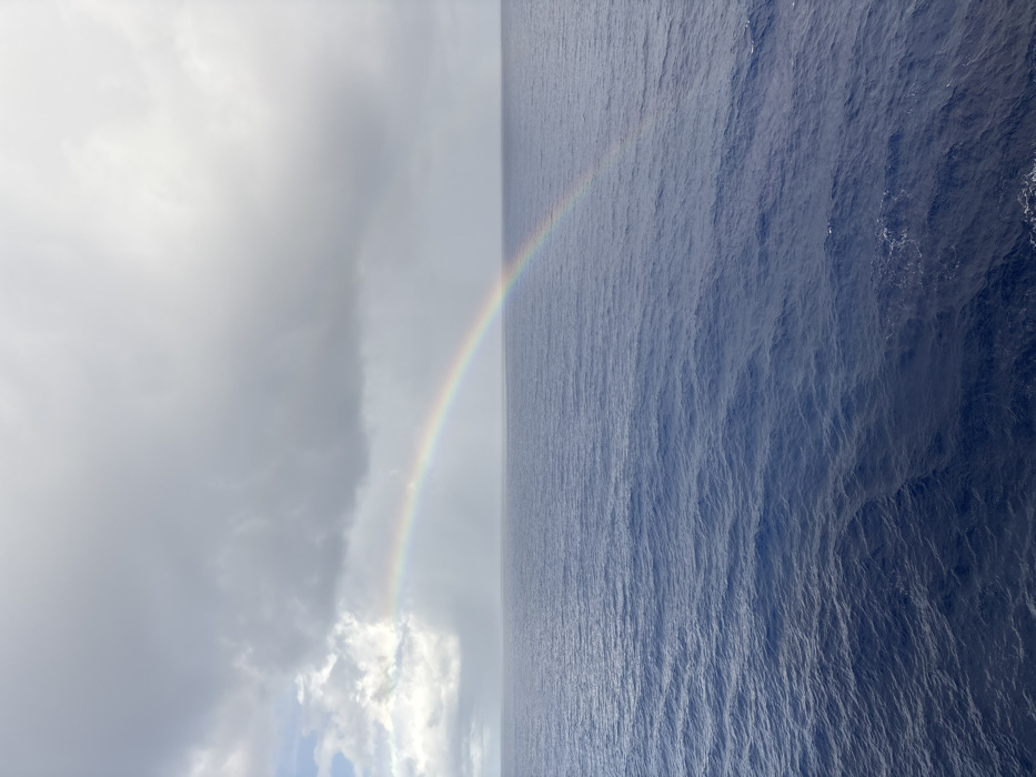 The image depicts an open maritime environment under a largely overcast sky, observed adjacent to the city of Unknown, Cuba. A vibrant, multi-colored rainbow forms a distinct arc across the middle of the frame, spanning from the left to the right horizon. The sky is dominated by heavy, dark grey cloud formations, with brighter, lighter-toned clouds and patches of blue sky visible in the upper-left quadrant. Below the horizon line, the ocean water is dark blue, displaying numerous ripples and small waves across its surface. No landmasses, vessels, individuals, or man-made objects are visible within the frame. The presence of the rainbow indicates atmospheric moisture and sunlight breaking through the cloud cover.
