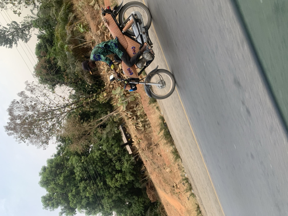 A man rides a motorcycle on a paved road. The motorcycle has a patterned seat cover. The man wears a hat, long-sleeved patterned shirt, and dark pants. Vegetation including trees and bushes line the roadside. The sky appears overcast.