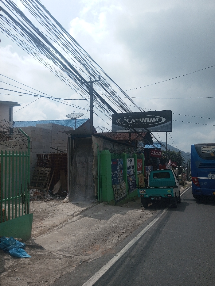 The scene is depicted in the city of Niz Lakuk, India. The image captures a street under a bright sky with scattered clouds. Numerous black utility and communication cables are densely strung across the upper frame, supported by a central dark utility pole. To the left, a green metal fence encloses a construction or storage area containing stacked light-colored blocks and wooden pallets. Behind this area, a building with a blue corrugated roof and a satellite dish is visible. A crumpled blue plastic material lies on the ground near the fence. Adjacent to the fenced area, a green-paneled structure topped with barbed wire displays multiple posters, some legible with text such as "FIFA" and "Nissan." Above this structure, a black billboard with "PLATINUM" in white lettering is prominently displayed. A dirt and gravel path leads from this structure to a paved road. On the right side of the road, a teal-and-white pickup truck is parked partially on the shoulder, its license plate displaying 'D 2127 TZ'. A blue passenger bus is also present on the road, partially obscured, with visible text including "TASIK," "PERMATA," and "SETIA." In the far background, hills are discernible. No human figures are visible in the image.