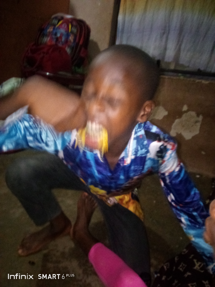 A child with dark skin eats something yellow, possibly corn on the cob. They wear a blue and white shirt and dark pants, barefoot on a dark floor. A backpack sits on a chair in the background. Someone wearing pink clothing is present at the lower left, and someone in black is to the right of the child. The picture is blurry, capturing a moment of motion. "Infinix SMART 6 PLUS" is visible at the bottom left.