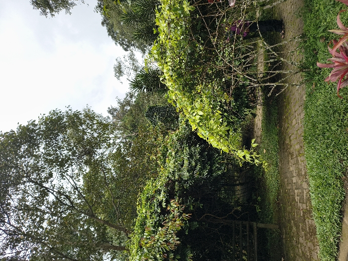 A narrow brick path winds through a lush, overgrown garden. Dense greenery drapes over the path, with vines and leafy plants abundant. Tall trees reach towards the sky, partially obscured by the thick vegetation. Grass and other foliage border the path. The sky is overcast, casting the scene in a soft, diffused light. The overall impression is one of a peaceful, secluded natural setting.