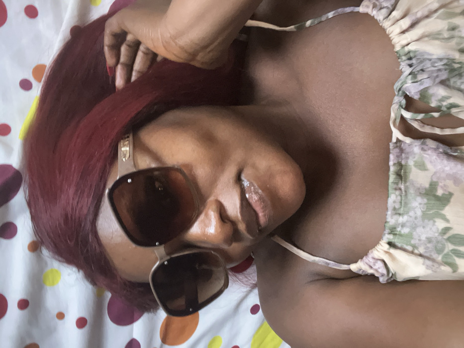 An adult female individual with dark skin, wearing large, square-framed sunglasses with dark lenses and light-colored frames, is depicted in a close-up, upward-angled shot. Her long, reddish-brown hair is prominent, with her right hand, featuring red nail polish, casually placed near her head. She wears a light-colored top with a floral pattern in green and purple/lavender hues, characterized by spaghetti straps and a tie-front detail. Her lips are visible below the sunglasses, exhibiting a glossy finish. The individual is positioned against a background of white fabric patterned with various multicolored circles (red, orange, yellow, purple, green). This scene is located in the city of Abuja, Nigeria.