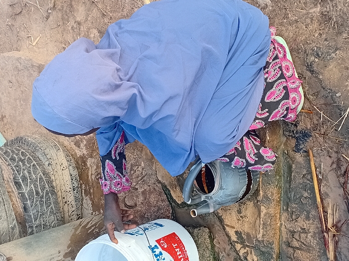 - "In Ayama, Nigeria, a solitary individual, observed from an elevated rear perspective, squats on uneven, damp earth and mud" by FM-TAum93, licensed under CC BY 4.0