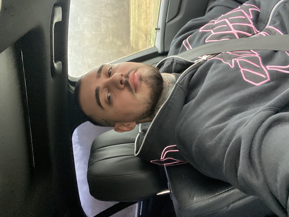 A male individual is depicted seated in the driver's compartment of a vehicle, located in Mikre, Bulgaria. The subject possesses short dark hair, a beard, and visible tattoos on his neck and left temple. He wears a black zippered hoodie with prominent pink embroidered designs on the front and a smaller corresponding design on the upper left shoulder. A diagonal seatbelt secures him across the torso. The vehicle's interior features black leather seating and a dark headliner with an integrated sunroof. The subject is facing forward, looking directly at the camera. Through the passenger side window, an indistinct outdoor environment is visible, characterized by distant trees and open ground under an overcast sky.
