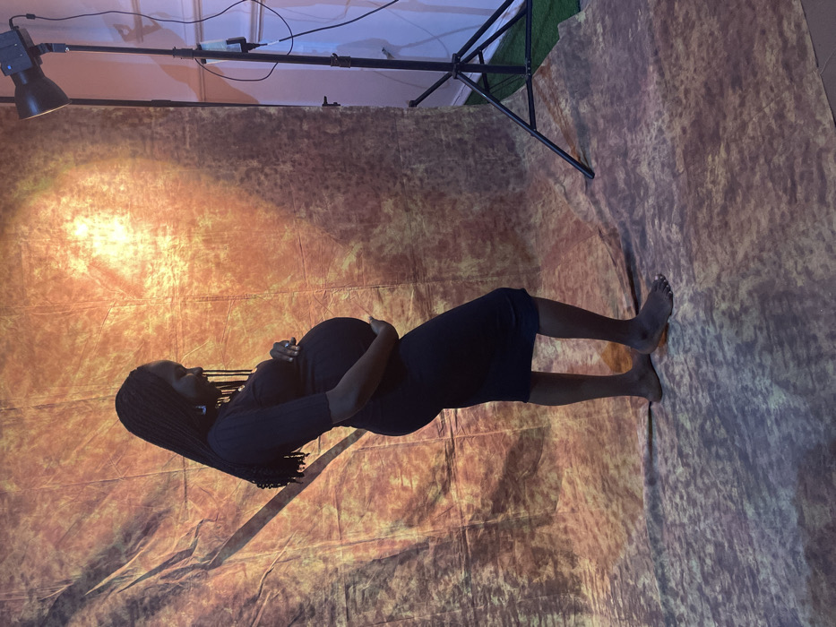 - "A pregnant woman with braided hair stands barefoot on an orange and brown textured backdrop" by FM-4qtZq2, licensed under CC BY 4.0