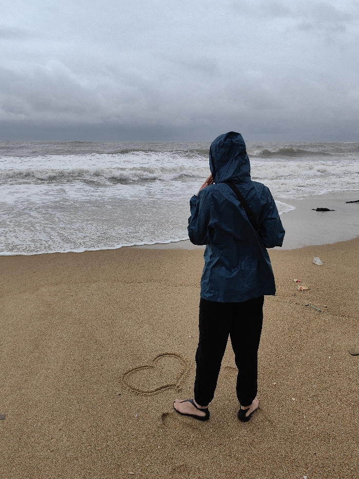 An individual stands on a sandy beach in Thuận An Ward, Vietnam, observed from behind. The person wears a dark teal or blue hooded raincoat with the hood up, black pants, and dark flip-flops. A dark strap, consistent with a cross-body bag, is visible across their back. The individual is positioned facing the ocean, where white-capped waves break onto the shore under a heavily overcast, grey sky. In the wet sand to the lower-left of the individual's stance, a heart shape has been drawn. Scattered debris, including light-colored plastic items, is present on the sand to the right of the individual. The immediate foreground is composed of light brown, wet sand.