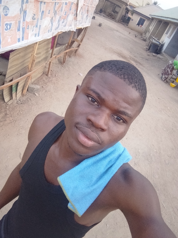 A dark-skinned man in a black tank top takes a selfie outdoors. He has a short haircut and a light blue towel draped over his shoulder. Behind him, a shanty-like structure with walls covered in printed material is visible. The background shows a dusty, outdoor area with houses and a few figures in the distance. The lighting is soft and even.