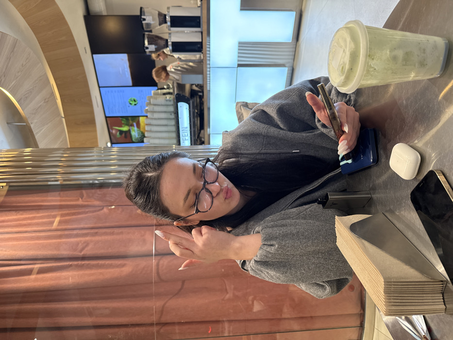 A woman wearing glasses and a gray jacket sits at a table. On the table are a cup with a lid, a blue phone, a white earbud case, a dark phone, a vape, and a stack of napkins. The woman is holding a vape pen and posing for the camera. In the background is a cafe counter with staff and menu boards. A pink curtain is visible in the lower left corner.