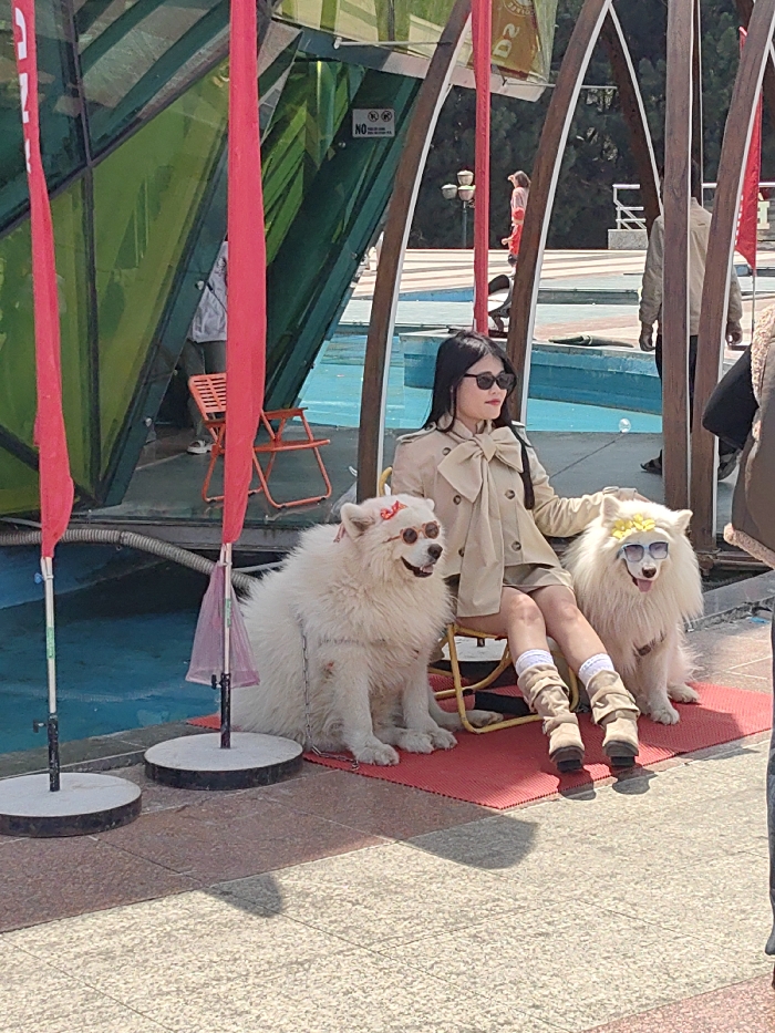 A person in a tan jacket, white socks, and tan shoes sits on a yellow chair between two fluffy white dogs. Both dogs wear sunglasses. One dog has a red bow on its head, and the other has yellow flowers. The scene takes place outdoors by a body of water with red flags. A green structure is in the background.