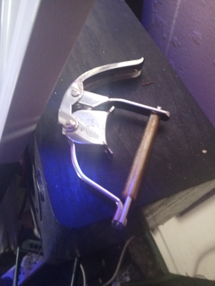 A silver guitar capo sits on a dark, textured surface. It has a hinged clamp with a brown wood-covered bar for applying pressure to the strings. The upper arm is slightly raised. Underneath, a blue glow illuminates the edge of a speaker or other electronic device with visible ports and wires. The background is blurred, suggesting a close-up shot in a cluttered environment. A partially visible white object rests on the top left corner of the image.