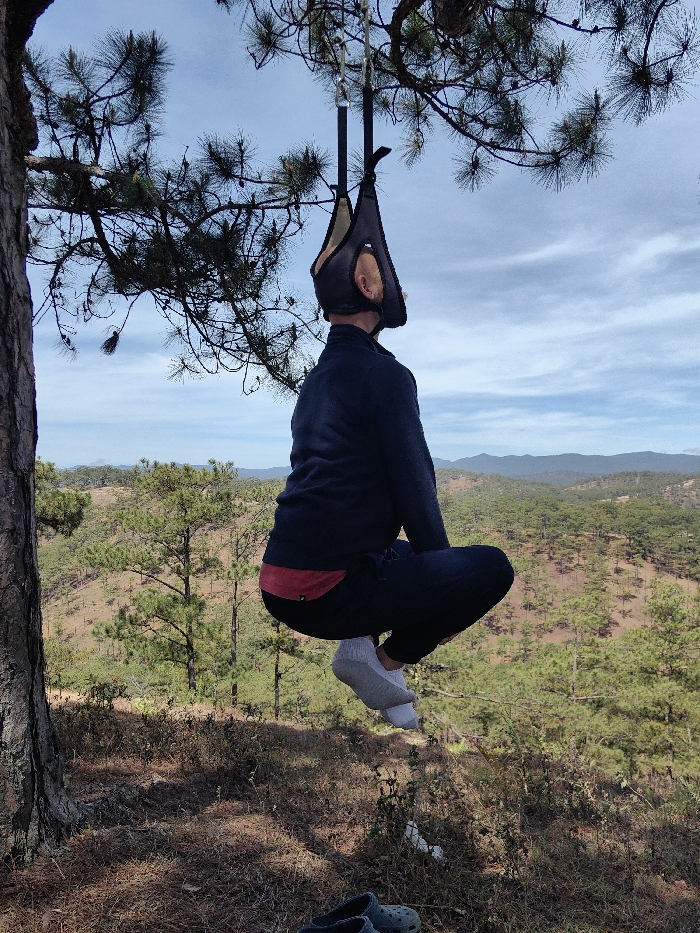 A person is suspended from a tree branch by a device around their head, in a squatting position. The person wears dark clothing and light gray socks. Below them, on the ground, are a pair of dark-colored shoes. In the background is a hilly landscape covered with trees and vegetation, under a cloudy blue sky. A tree trunk is on the left side of the frame.