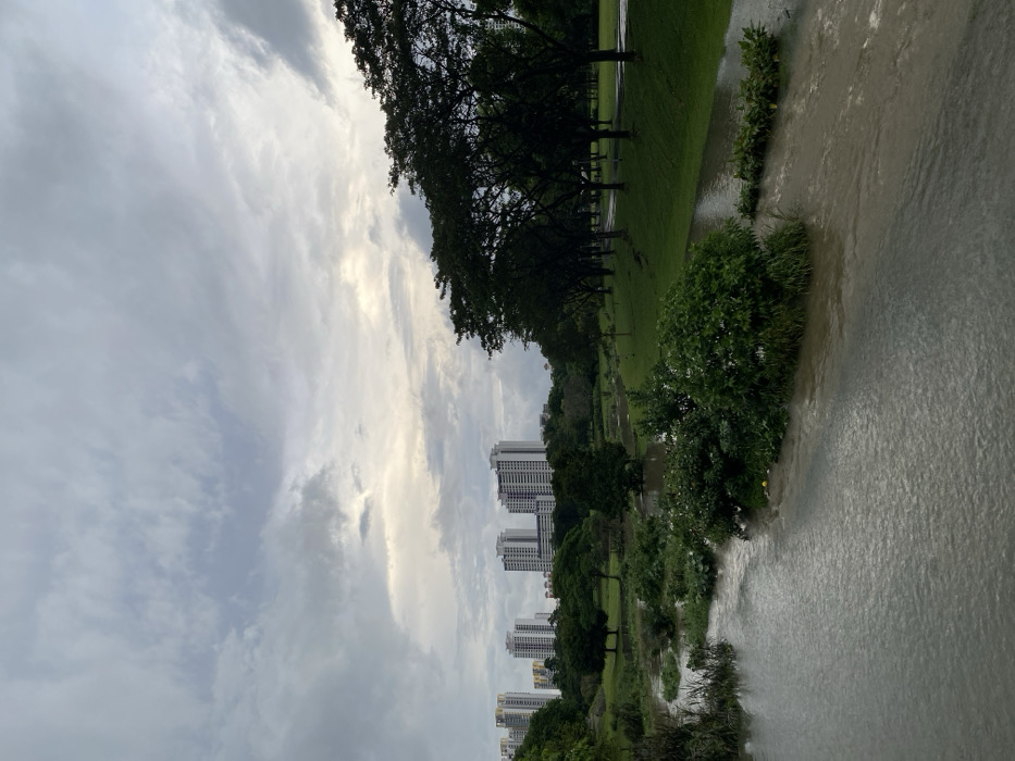 The image depicts an elevated view of Bishan-Ang Mo Kio Park in Singapore, focusing on the naturalized Kallang River and its surrounding parkland. The foreground is dominated by the river, characterized by wide, flowing, muddy-brown water with visible currents and ripples. Lush green aquatic and riparian vegetation, including shrubs and grasses, grows along its banks and forms small islands within the channel. A small yellow object is partially submerged near a dense cluster of vegetation on the left bank. Beyond the river, well-maintained green grass slopes extend upwards, forming the park landscape. On the right side of the frame, a dark, paved pathway, likely for pedestrians or cyclists, runs parallel to the river. This path is bordered by a continuous line of mature, tall trees with dense, dark green canopies. Additional trees and shrubs are scattered across the park. In the mid-distance and background on the left, several tall, multi-story residential buildings, primarily white or light-colored, are visible above the tree line, indicative of apartment or condominium complexes within the city. The sky above is overcast with varying shades of grey and white clouds, with a brighter, lighter patch of sky evident towards the upper center, suggesting diffused light. No human figures or animals are present in the scene. The high, turbid water level in the river suggests recent heavy rainfall or increased flow.