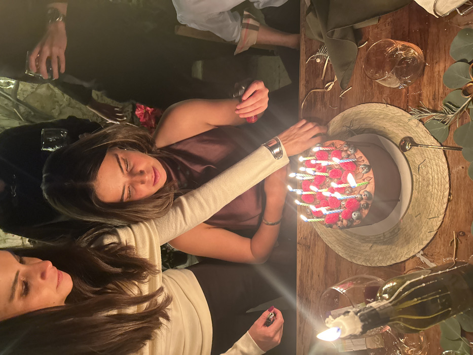 A group gathers around a wooden table, celebrating with a birthday cake adorned with burning candles and raspberries. The cake sits on a straw plate. Two women are prominent in the foreground. A wine bottle and glass are also visible. One woman has a lighter in her hand. The atmosphere is warm, with soft lighting adding to the celebratory mood.
