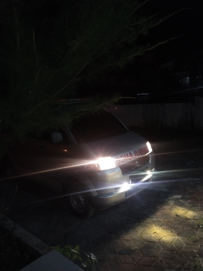 The image captures a static nighttime scene in Lhokseumawe, Indonesia. A light-colored van-style ambulance is parked on a paved surface composed of hexagonal interlocking pavers. The vehicle's headlights and front fog lights are illuminated, producing strong light flares and projecting light onto the ground directly ahead. The word "AMBULANCE" is visible in red, reversed (mirror-imaged), across the front hood of the vehicle. A tree branch with dark, needle-like foliage partially obstructs the upper left portion of the frame and the top of the ambulance. In the background, a low wall or fence is visible, with dimly lit building structures discernible behind it. No individuals or active subjects are present in the scene.