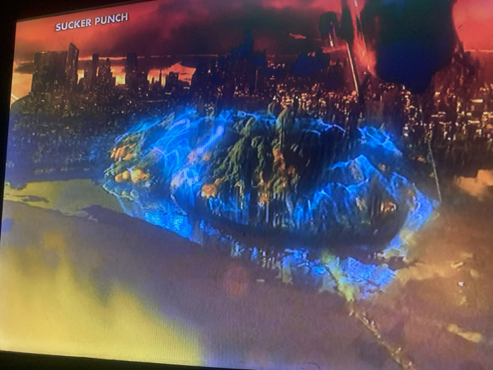 The image depicts a surreal, possibly apocalyptic scene. A large landmass or island floats in the sky, illuminated with a glowing blue energy. Sparse orange structures dot its surface. Above, a futuristic cityscape looms under a dark, reddish-orange sky, suggesting a dystopian or science-fantasy world. The reflection of the island can be seen in the misty atmosphere below. The title "Sucker Punch" is visible in the top left corner.