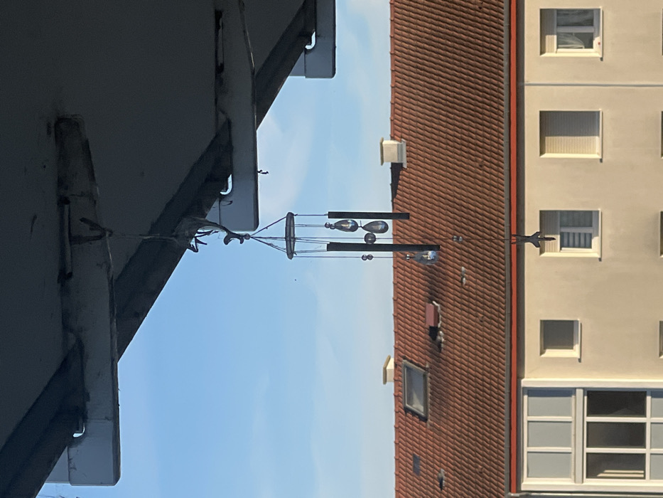 The scene presents an exterior view from below a balcony or structural overhang, looking towards a residential building in Strasbourg, France, under a clear, bright blue sky. In the immediate foreground, a wind chime hangs suspended from a dark, stylized, hook-like bracket attached to the underside of a light-colored, possibly concrete or metal, overhead structure. The wind chime features a circular top ring, from which hang four vertical black rectangular chimes and three clear, teardrop-shaped glass or crystal ornaments that reflect light. A dark, stylized finial element is visible at the very bottom of the chime assembly. The midground is dominated by the sloped, reddish-orange tiled roof of a multi-story building, characteristic of Alsatian architecture. Several rectangular skylight windows are set into the roof, one of which appears partially open. A small, light-colored chimney or vent is also visible on the roof. Below the roofline, the building's facade is a light beige or cream color. Multiple windows with white frames are present: a large, multi-pane window section occupies the lower-left, while to its right, several smaller rectangular windows are visible. Some of these smaller windows feature external roller shutters, with one partially lowered and another fully closed. The window on the far right displays white curtains internally. The background consists of an expansive, cloudless blue sky, indicating fair weather. No individuals or discernible actions are present within the frame.