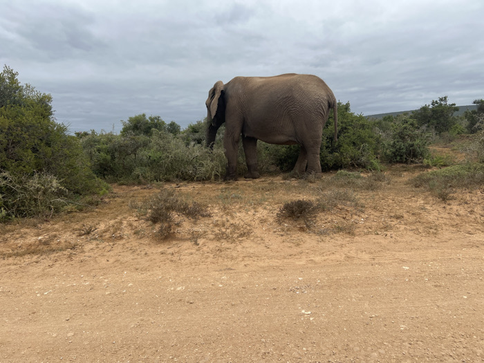 An adult African elephant stands on reddish-brown earth adjacent to a dirt track in the Sundays River Valley Local Municipality, South Africa. The elephant is positioned slightly left of center, with its body angled slightly away from the viewer, and its head turned to the left, partially obscured by and appearing to interact with dense green and grey-green shrubbery. Its grey-brown, wrinkled hide is visible. The foreground consists of a reddish-brown dirt road with scattered small stones and sparse dry vegetation clumps. Beyond the elephant and foreground, the midground and background are composed of thick bushveld under an overcast sky of uniform grey clouds. No other individuals or artificial structures are present.