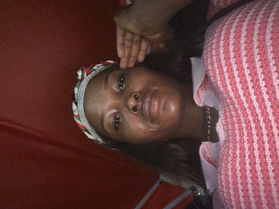 A dark-skinned woman with a nose piercing poses in a rotated indoor selfie. She's wearing a patterned headscarf and a pink striped knit top with a white collar. Her dark hair frames her face. She has one hand raised near her forehead. A gold chain necklace is visible. A red wall is partially seen in the background. The photo appears to be taken in low lighting.